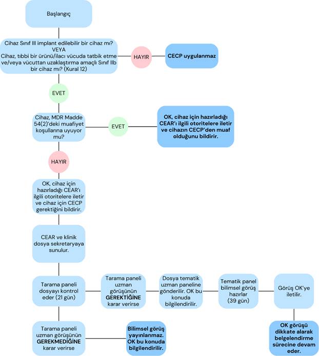 MDR Madde 54(1) kapsamında CECP gerektiren cihazlar için Onaylanmış Kuruluş (OK), öncelikle Madde 54(2)’deki muafiyet koşullarının uygulanıp uygulanamayacağını değerlendirir. Değerlendirme sonucunu Yetkili Makamlara ve Komisyona bildirir. CECP gerekiyor ise OK, uzman panel başvurusunu başlatır.
